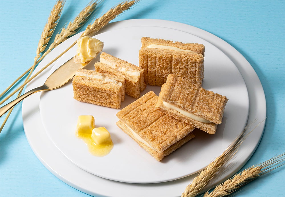 全粒粉やライ麦など7種素材の特製シリアル生地に発酵バター香るオリジナルブレンドバターとシュガーをかけあわせてこんがり焼いた、くせになる香ばしさとサクサク食感。一度食べたら忘れられなくなるミルキー感が自慢のホワイトショコラをサンドしました。