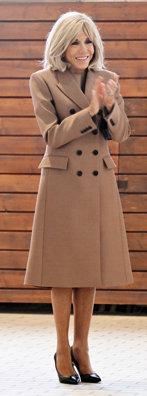 ブリジット·マクロン仏大統領夫人は、キャメルカラーのミディ丈スーツドレスに、同カラーのカシミアダブルブレストコートを合わせました。