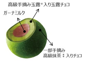 ガーナミルクと玉露と抹茶、こだわりの3層に仕立てた最高位茶師酢田恭行氏監修の玉露トリュフ。