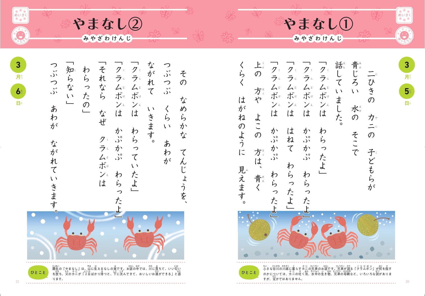 『頭のいい子を育てる 名作おんどく366』は、特に「名作」にこだわった1冊。清少納言や吉田兼好、松尾芭蕉や与謝野晶子、アンデルセンやイソップ、夏目漱石、宮沢賢治、谷川俊太郎、金子みすゞ……物語、詩、俳句や和歌、百人一首や童謡、言葉遊びや偉人たちの名言など10ジャンルから、子どものうちに触れておきたい古今東西の作品が366日分勢ぞろい。基本1日1ページ、1分ほどで読めるから、忙しい生活の中でも負担になりません。
