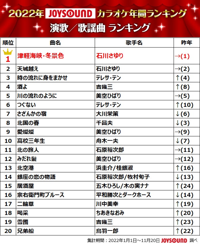 今年も、石川さゆり「津軽海峡・冬景色」「天城越え」がワンツーフィニッシュ!続く3位は、テレサ・テン「時の流れに身をまかせ」、4位は吉幾三「酒よ」と、順位の入れ替わりはあるものの、往年の名曲が変わらぬ人気を示しました。なお、今年リリースされた楽曲の首位は坂本冬美「酔中花」。