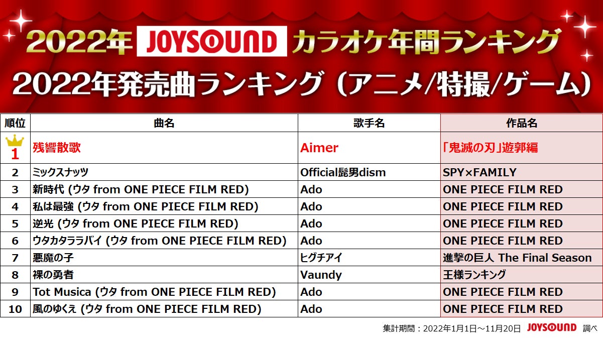首位の『鬼滅の刃』遊郭編のOP曲 Aimer「残響散歌」をはじめ、『SPY×FAMILY』や『ONE PIECE FILM RED』の関連曲など、TOP10中6曲をアニメソングが占める結果に!
