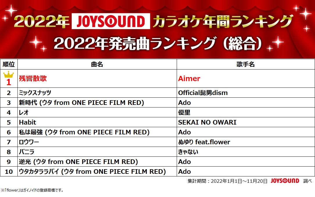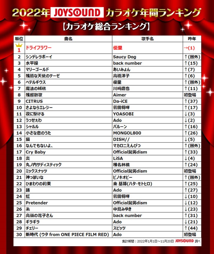 JOYSOUNDが2022年カラオケ年間ランキングを発表!優里「ドライフラワー」が、2年連続首位を獲得!アーティストでは、ヒット曲連発のAdoが初の頂点に!