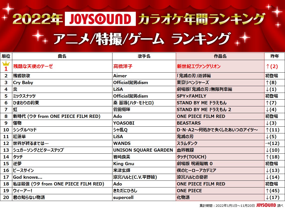 カラオケの定番曲の高橋洋子「残酷な天使のテーゼ」が堂々の1位!本楽曲は、通信カラオケ誕生から30年間で、最も歌われた楽曲としても首位に輝きました。『SPY×FAMILY』OP主題歌のOfficial髭男dism「ミックスナッツ」は、リリースからわずか約7ヶ月で5位を獲得。『鬼滅の刃』をはじめ、国内外で大ヒットを記録した映画『ONE PIECE FILM RED』の関連曲が複数曲ランクインを果たしています。