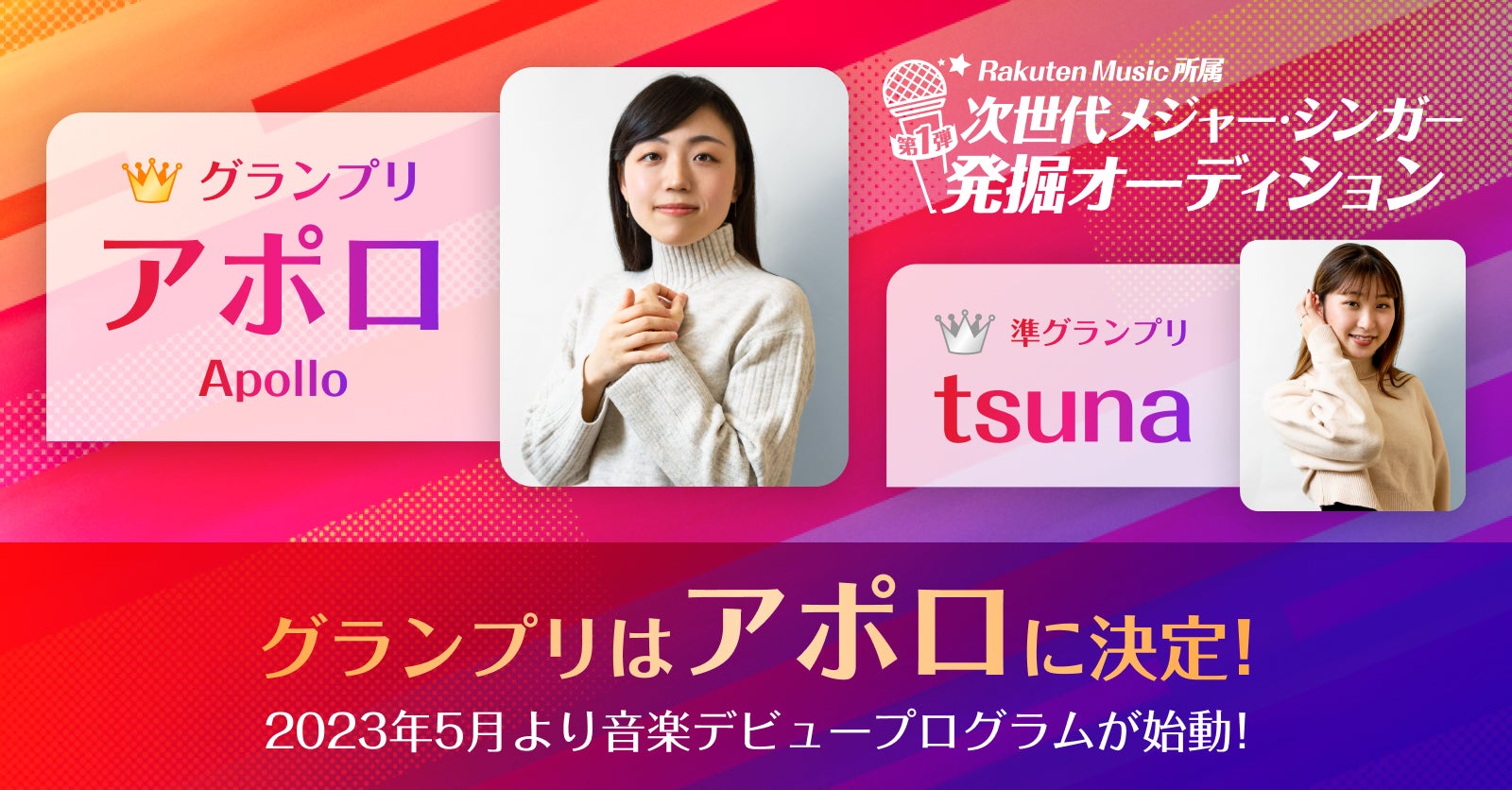 楽天グループ株式会社(以下「楽天」)が運営する定額制の音楽聴き放題サービス「Rakuten Music」は、「Rakuten Music所属 第1弾 次世代メジャー・シンガー発掘オーディション」のグランプリをアポロ、準グランプリをtsunaが受賞したことを発表しました。
