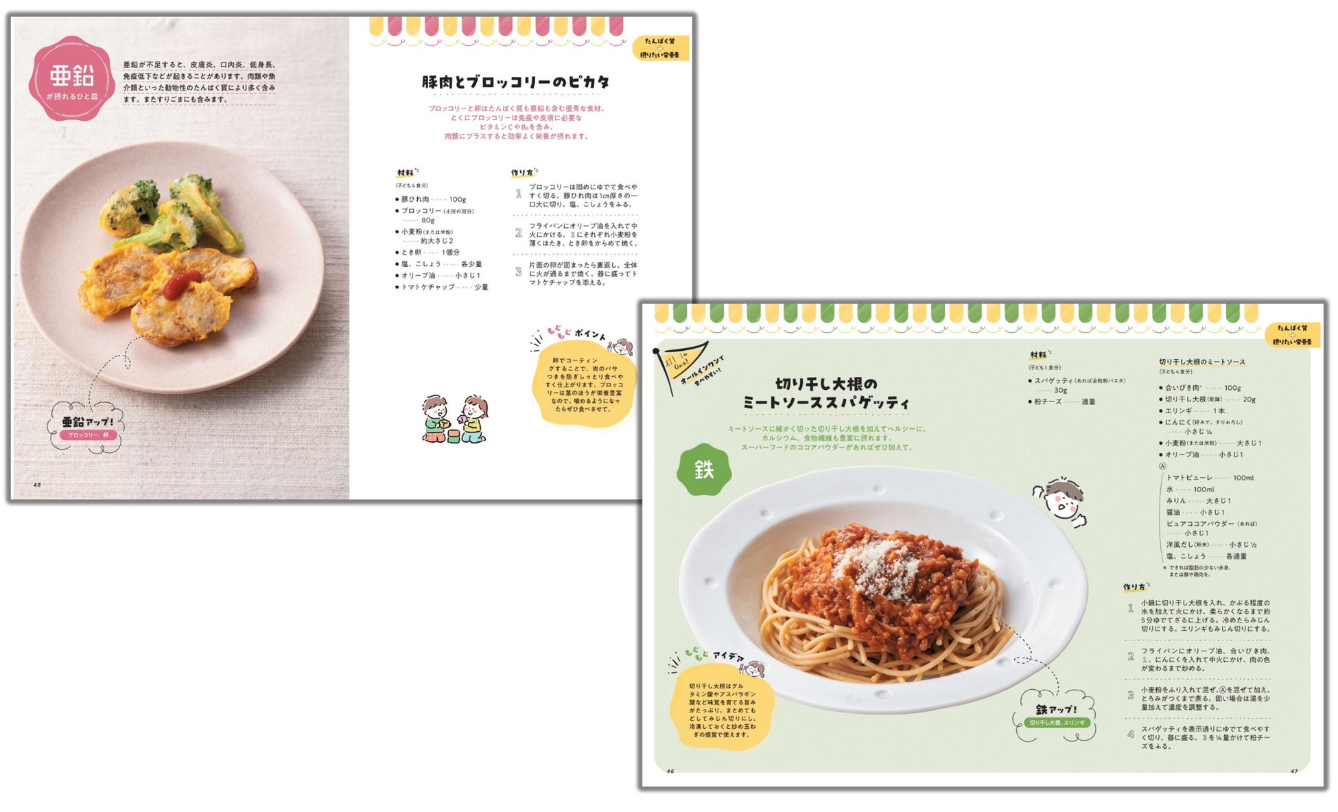 幼少期に必要な栄養(たんぱく質、鉄、亜鉛、ビタミンDとカルシウム、ビタミンB群、オメガ3系オイルなど)を効率よく摂れるレシピを多数紹介しています。全て「子どもの分だけ取り分ける必要がないレシピ」なので、親子で同時に栄養を摂ることができるのも本書の魅力のひとつです。