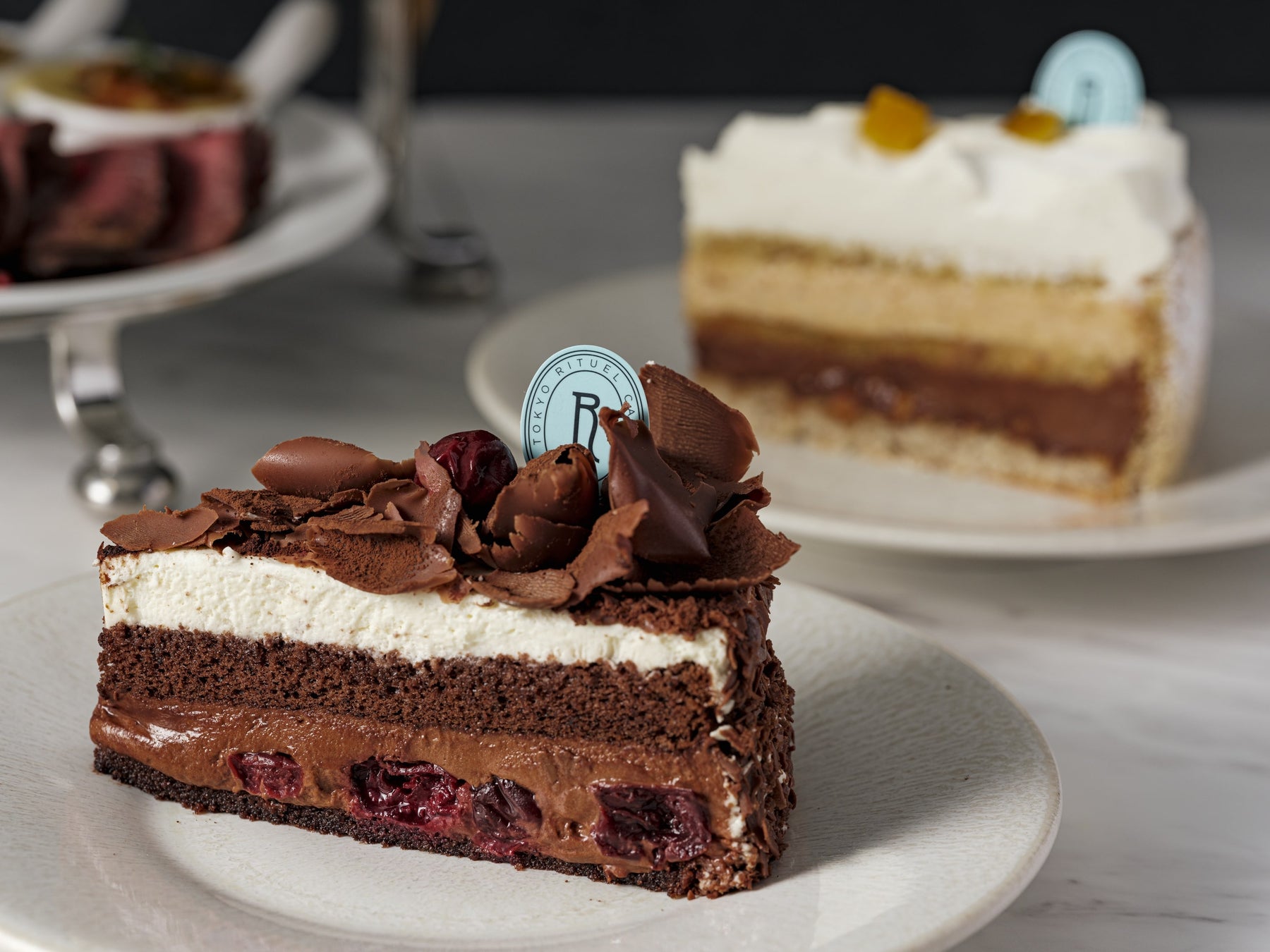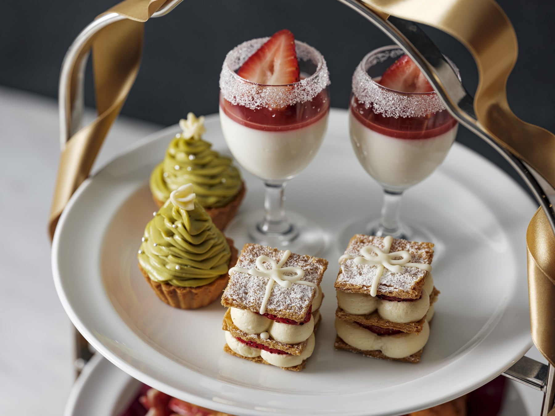 RITUEL CAFÉ ルミネ新宿店では、3段のアフタヌーンティースタンド、別皿でお好きなカットケーキを約 10 種類の中からおひとつずつお選びいただけます。クリスマスツリーを模ったピスタチオチーズクリームのタルトやカクテル風に仕上げた苺のブランマンジェや、まるでクリスマスプレゼントのようにホワイトチョコレートのリボンをかけた苺のミルフィーユが並びます。
