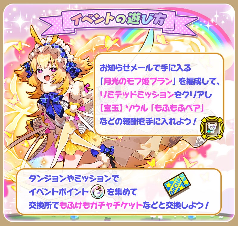 また、期間中ログインすると新登場の「月光のモフ姫ブラン」をお知らせメールにて必ず1回お届けします。「月光のモフ姫ブラン」を編成して挑戦するイベントミッションも実施するので、ぜひご参加ください。その他、ログインボーナスとして「光結晶」を最大14個ゲットするチャンスも。