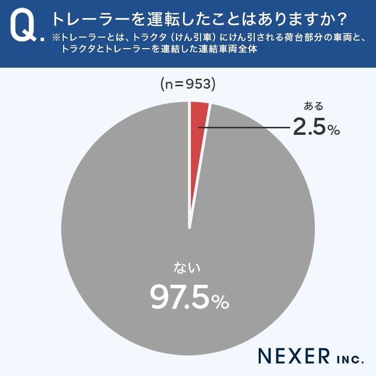 トレーラーを「運転したことがある」と回答した方はわずか2.5%に留まり、97.5%が運転経験がないという圧倒的な差が見られました。