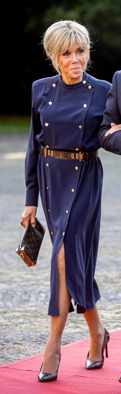 ブリジット·マクロン仏大統領夫人は、ブルーシルクのダブルブレストロングスリーブドレスにモノグラムのベルトを合わせました。