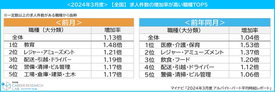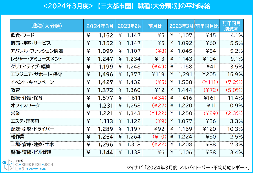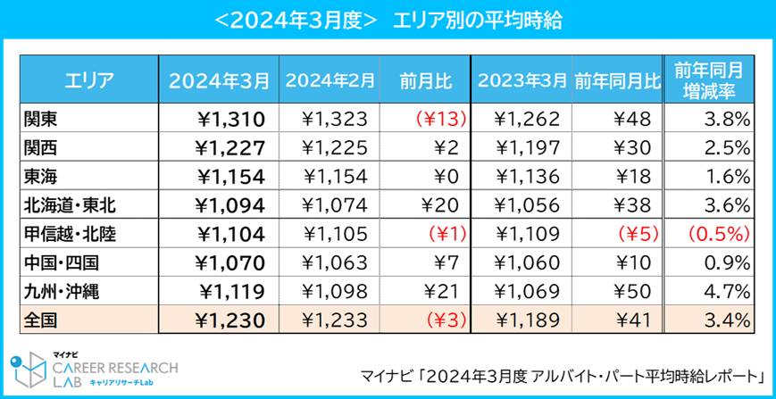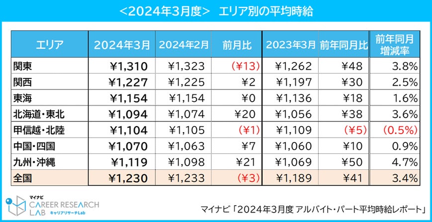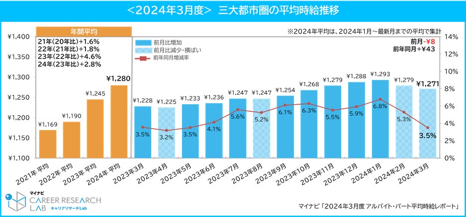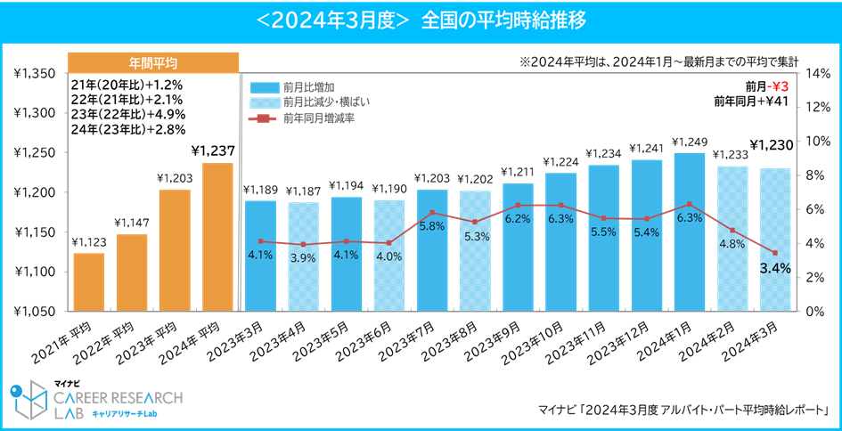 マイナビ、「2024年3月度アルバイト・パート平均時給レポート」を発表