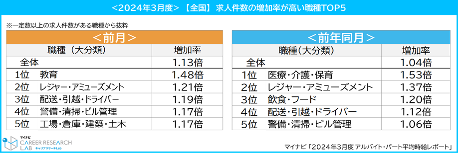 職種(大分類)別では、[飲食・フード]が1,152円(前月比:5円増、前年同月比:45円増)で、23年2月以降は1,100円以上で推移し、直近は9カ月連続で過去最高額を更新。また、求人件数は前月比で1.15倍に増加、前年同月比で1.23倍に増加している。