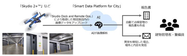開発するソリューションは、NTT Comが販売するドローン「Skydio 2+™」などを遠隔操縦したり、自動巡回を実現するソリューション「Skydio Dock and Remote Ops.」(※3)により取得した物流施設内の画像データを「Smart Data Platform for City」(※4)(以下「SDPF for City」)へアップロード。AI(※5)が画像解析することで、設備の損傷や不審物などの異常を検知するものです。異常を検知した場合、建物管理者・警備員に異常箇所と検知内容を発信するとともに、自動で報告書を作成します。