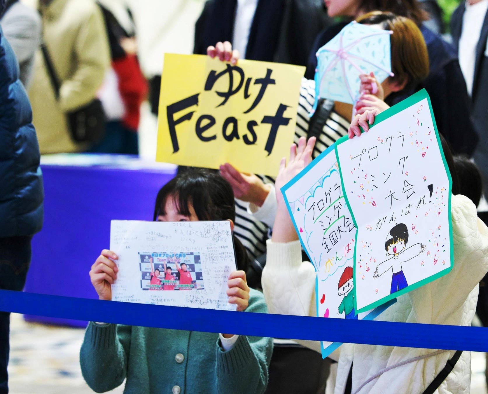 2024年12月8日(日)、池袋・サンシャインシティの噴水広場にて、ついに決勝大会が開催されました。日本一の小学生プログラマーの座をかけ、4チーム・12名の選手による、熱い戦いがおこなわれました。会場には、応援グッズなどをもって駆けつけたオーディエンスに加え、小学生のプログラミングスキルの高さに思わず足をとめる方々も多く集まり、熱戦を見守りました。