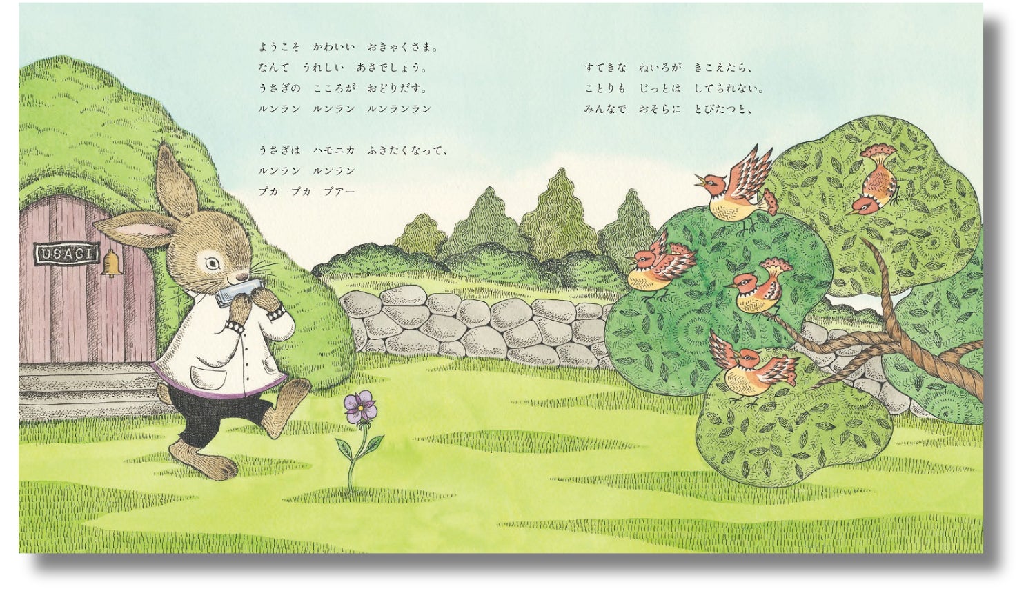 うさぎの庭に咲いた一輪の野の花が、うさぎの心を躍らせ、ハモニカのメロディーをうみだし、鳥を空へまいたたせます。