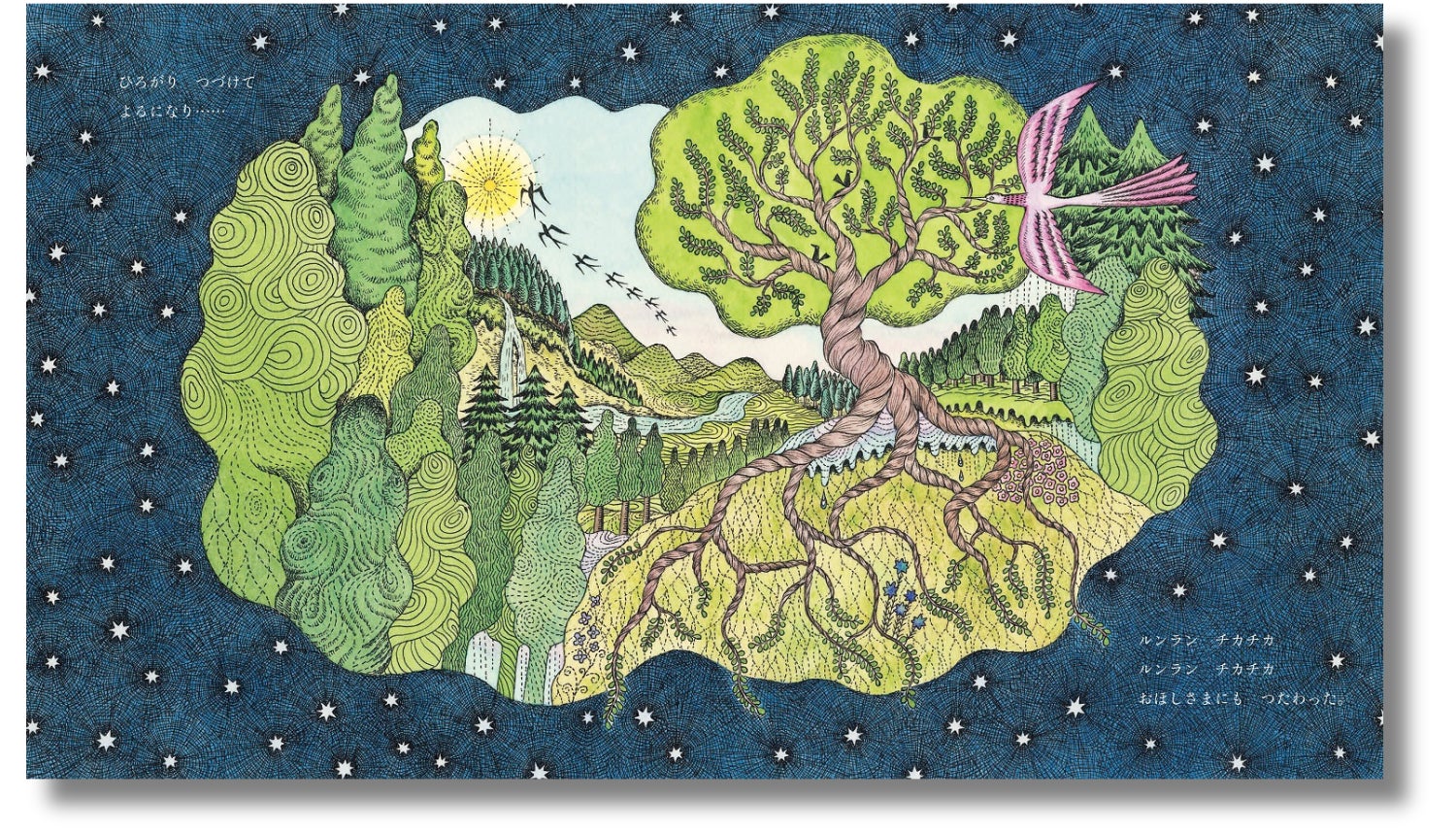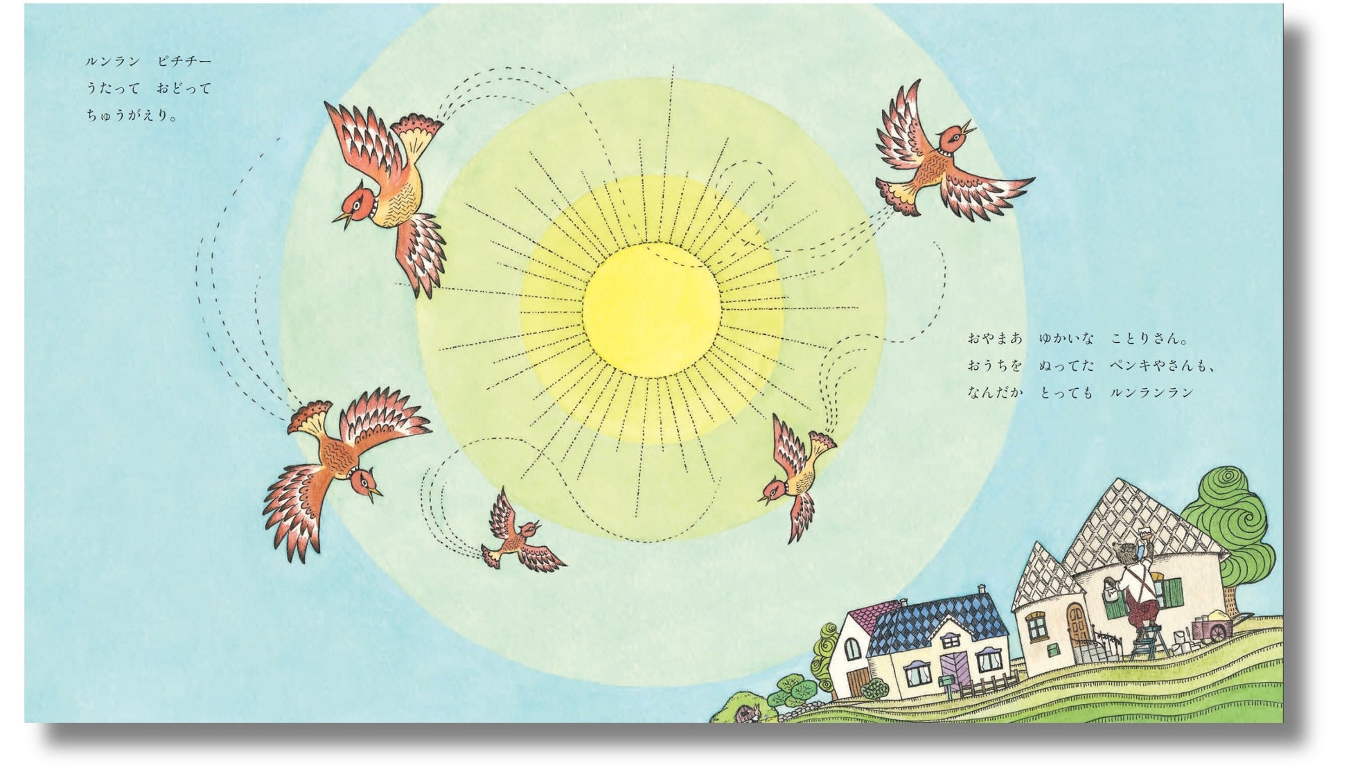 そうして、ルンランはどこまでも広がっていき……。思わず口ずさみたくなる「ルンラン」のリズムにのせて、小さなしあわせがつながり、広がり……。