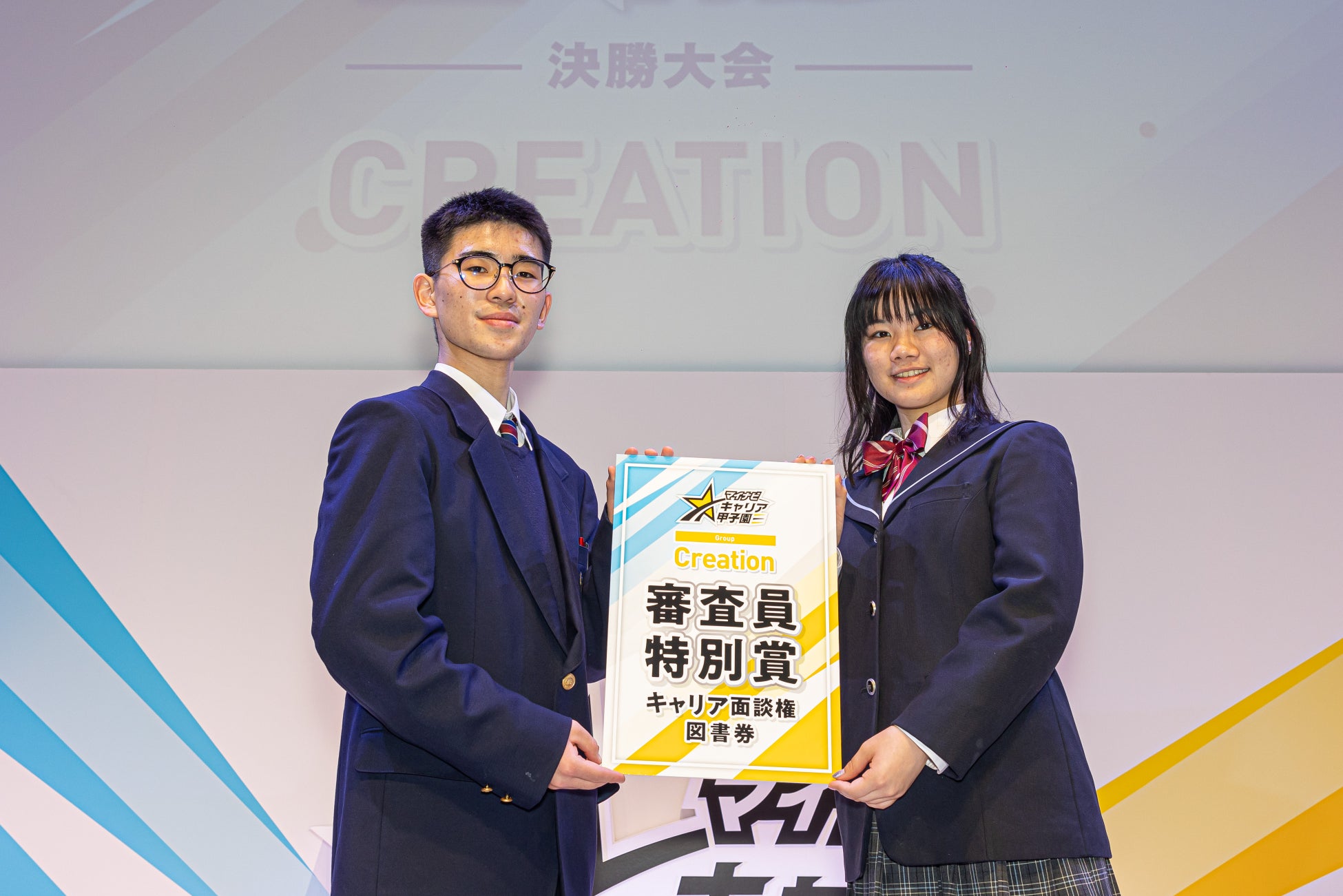 審査の結果、Creation部門では、渋谷教育学園幕張高等学校/麻布高等学校高校(生命保険協会代表)の「質疑応答独占」チーム、Innovation部門では香里ヌヴェール学院高等学校(Dynabook代表)の「秘密結社 TONOTOKERAI (トノトケライ)」チームが優勝に輝きました。優勝チームには、トロフィーと賞品として100万円分の無期限海外旅行券を贈呈しました。