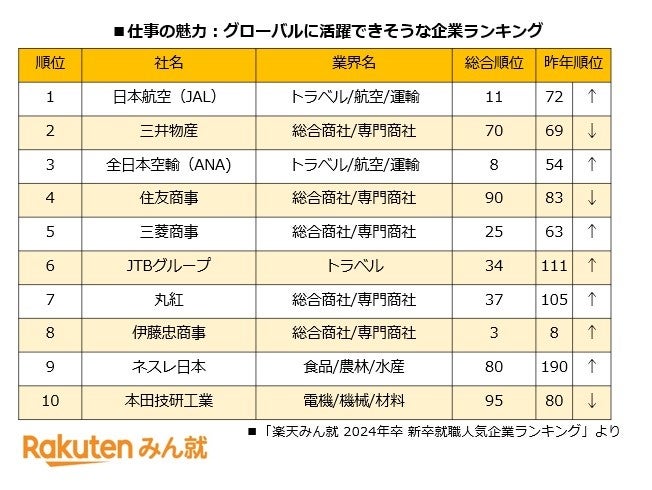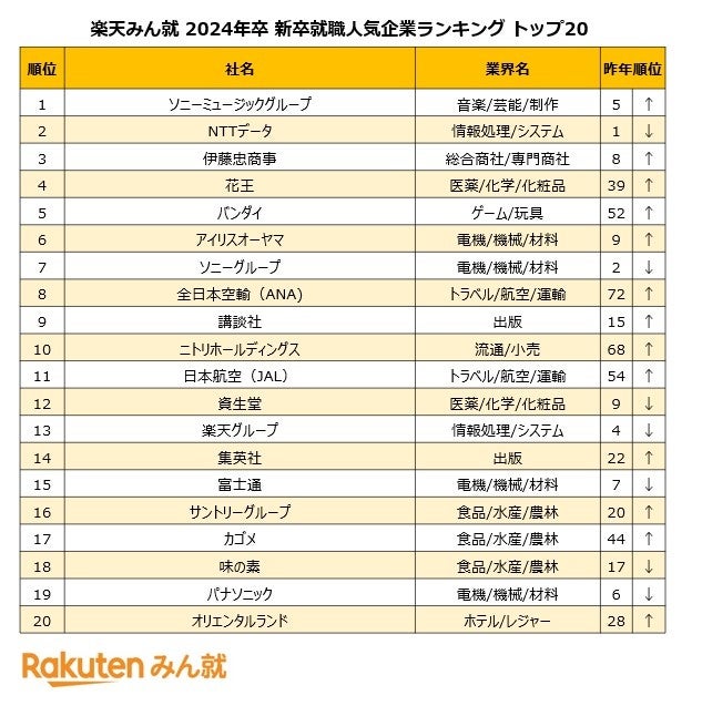 楽天、「楽天みん就 2024年卒 新卒就職人気企業ランキング」を発表