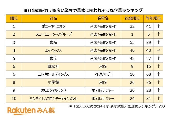 また、志望理由別ランキングでは、「仕事の魅力」の項目における「幅広い業界や業務に関われそうな企業ランキング」で、総合ランキング首位のソニーミュージックグループを含むエンタメ関連企業8社が10位以内にランクインしており、マルチスキルを求める就活生がエンタメ関連企業に対して高い興味を持っていることが見受けられます。