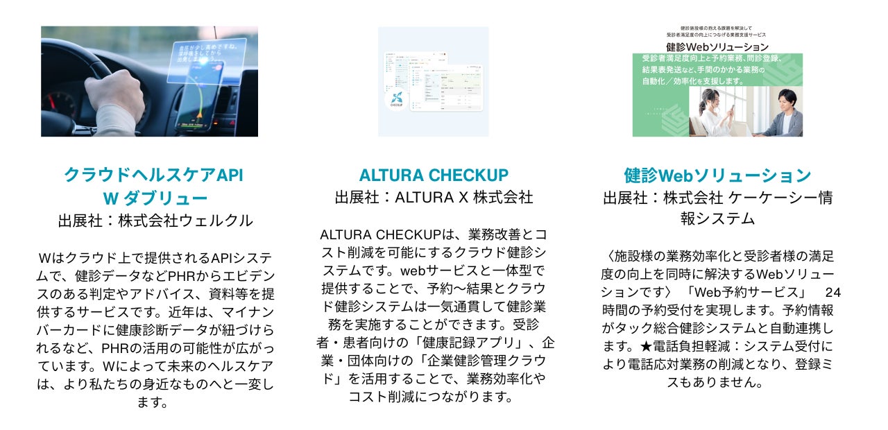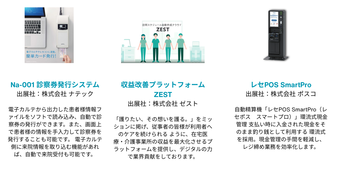 一番の見どころは、出展製品が多岐にわたること。自動精算機・電子カルテ・予約管理・健診システム・RPA・遠隔医療・遠隔モニタリング・遠隔リハビリ・研修ツール・人材紹介・医療機器/器具・歯科医院向け・在宅医療向け・美容医療向けの製品・サービスが出展します。