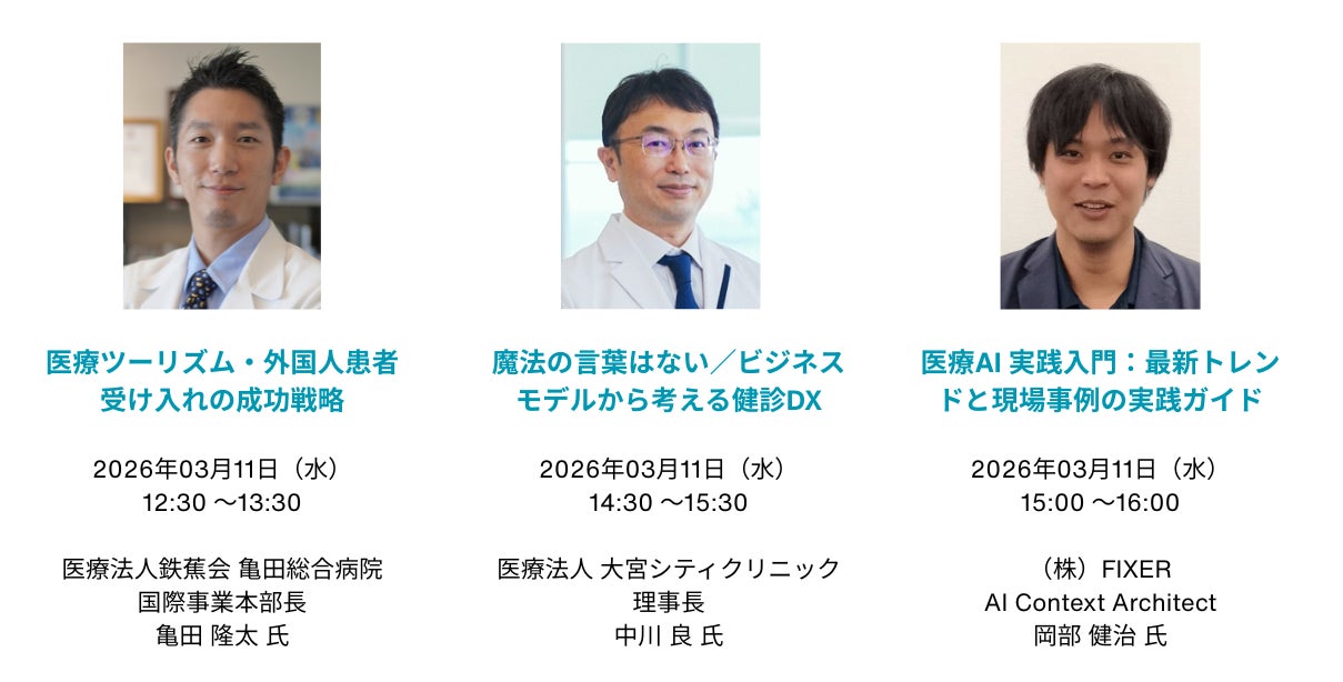 診療報酬改定はもちろん、亀田総合病院による【医療ツーリズム】、大宮シティクリニックによる「健診DX」、チャットGPTを実際に使用しながら医療現場での事例・実践ガイドを行う医療AI講座など、聞きどころ満載です。(下記セミナーを一部ご紹介)