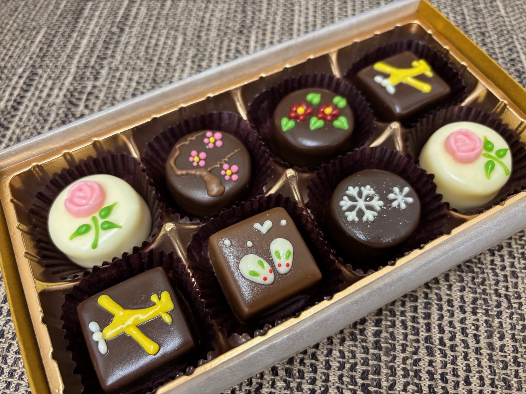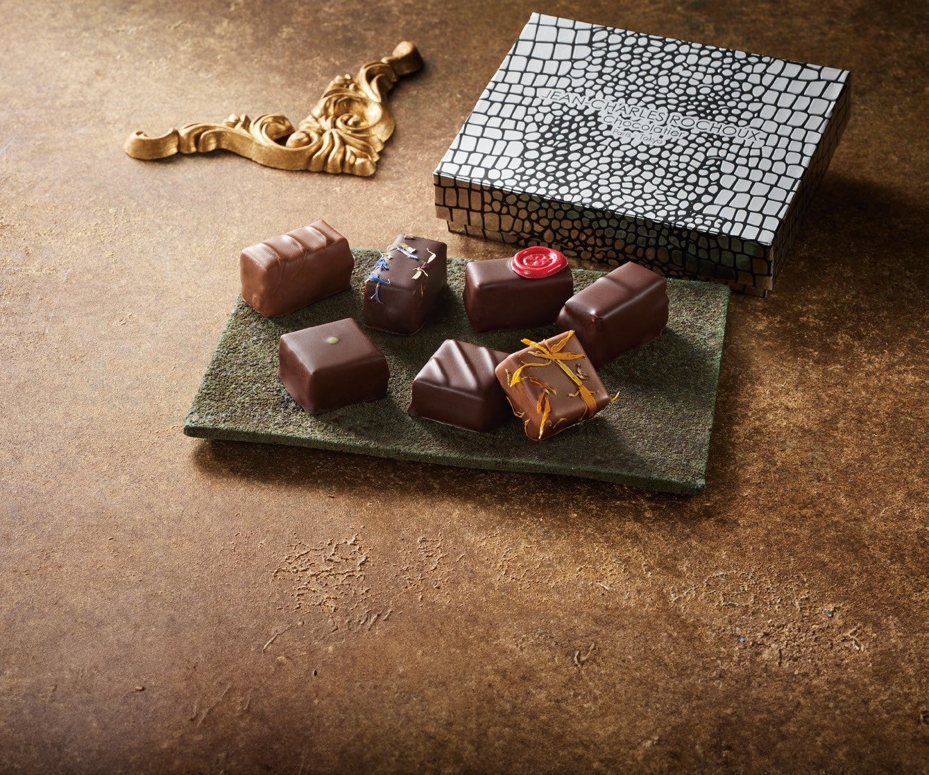 サントメ島産カカオのガナッシュや苺のガナッシュ、黒ゴマのプラリネなど、4種の味を詰め合わせました。