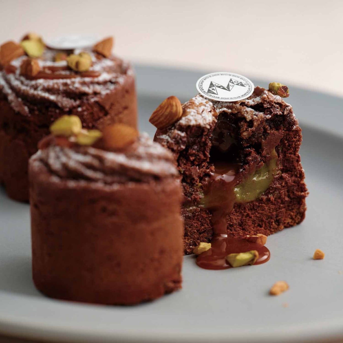 ガトーショコラにピスタチオのガナッシュを重ね、焼きあげ、キャラメルソースを絞りました。