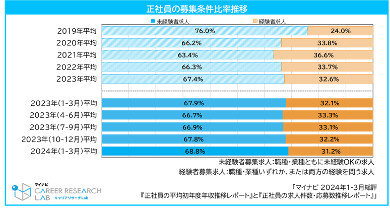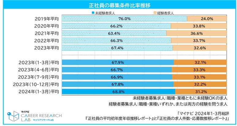 求人の経験者と未経験者の募集比率は、未経験者求人が68.8%、経験者求人が31.2%だった。2023年10-12月平均と比べ、未経験者求人の比率が微増している。【図3】