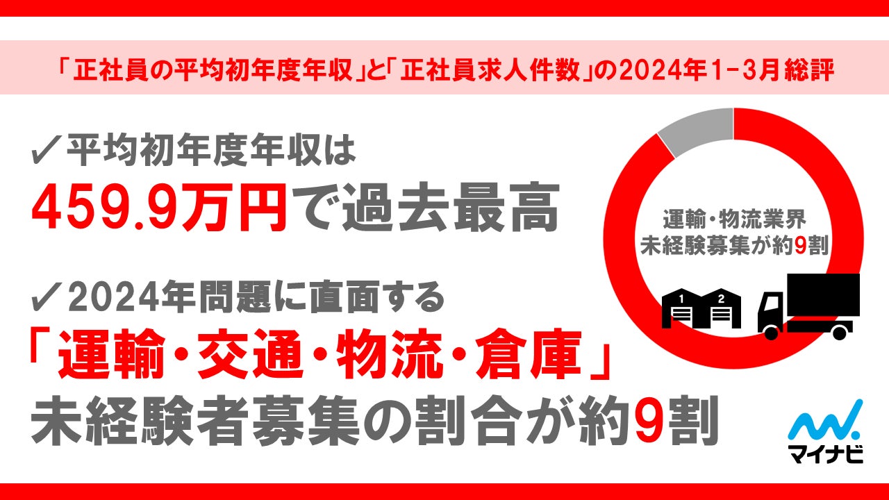 24年1-3月の平均初年度年収は459.9万円で過去最高。2024年問題への対応もあり「運輸・交通・物流・倉庫」業界では 「未経験者募集」の割合が業種別で最も高く約9割。
