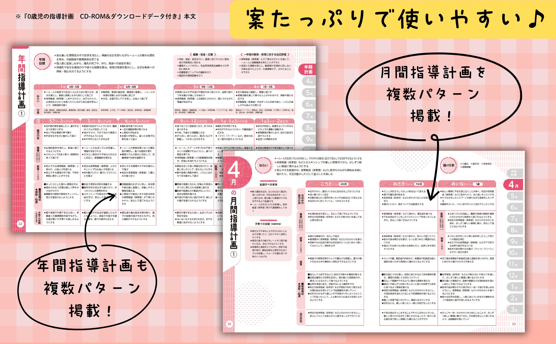 歳児別に、週案・日案・個別指導計画など必要な計画案もたっぷり掲載しています。