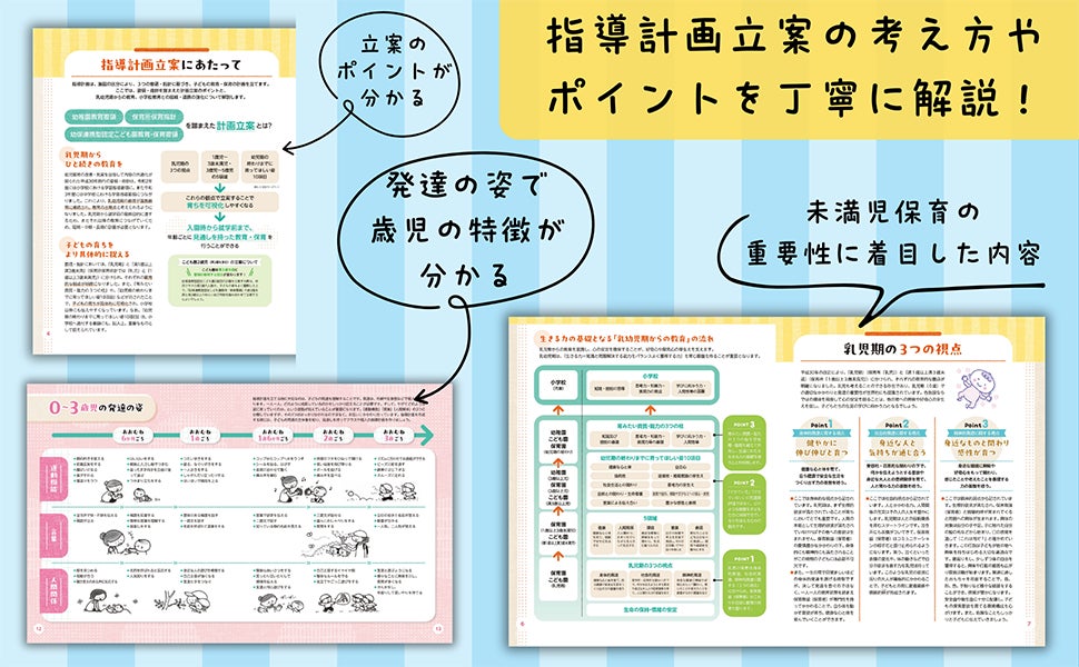 指導計画をどう作成していいか分からない! そんな保育士さんの困ったに応えます。指導計画の考え方やポイント、子どもの発達についても詳しく解説しているから、新人保育士の方や新たに0・1・2歳児を担当される先生にぴったりです。