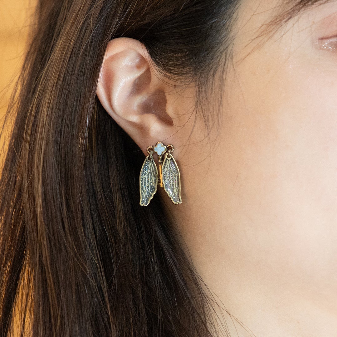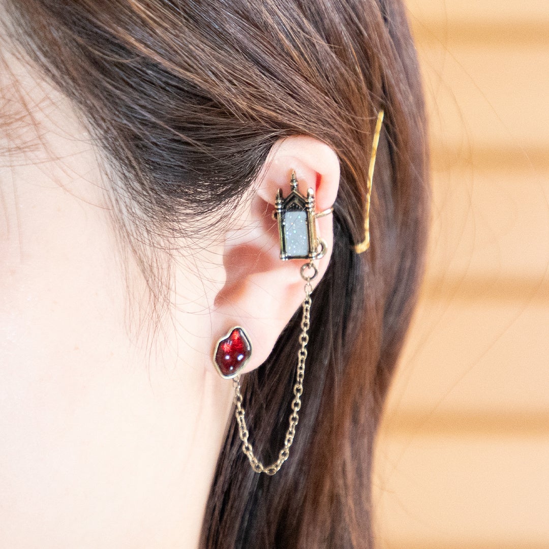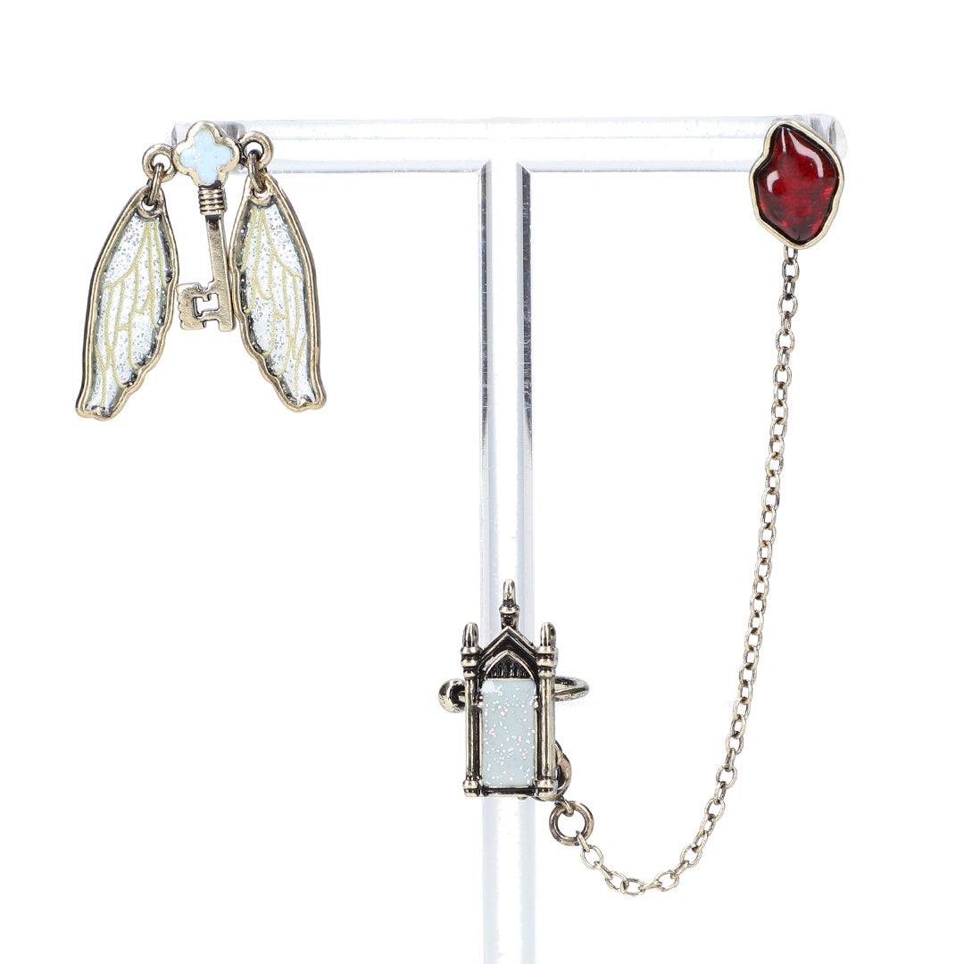 賢者の石とフライングキーのピアス、みぞの鏡のイヤーカフのセットアイテムです。賢者の石とみぞの鏡は専用のチェーンを付属することで、組み合わせて使用が可能。フライングキーは左右の羽がゆらゆらと揺れる仕様で、小ぶりながらも存在感を感じられます。