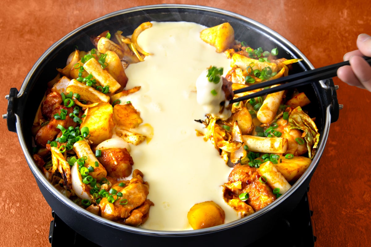 旨辛のチキンともちもちのトッポギでごはんがすすむ事間違いなし!とろ~りチーズに絡めてマイルドにもお召し上がりいただけます♪