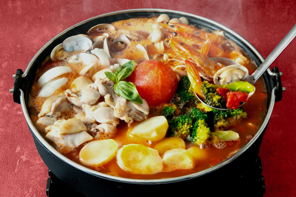 トマトが丸ごと1個入って酸味と旨味がさらにアップ★お肉にお野菜、魚介も味わえる大満足なお鍋です。仕上げにチーズをかけた贅沢イタリアンな洋風鍋。