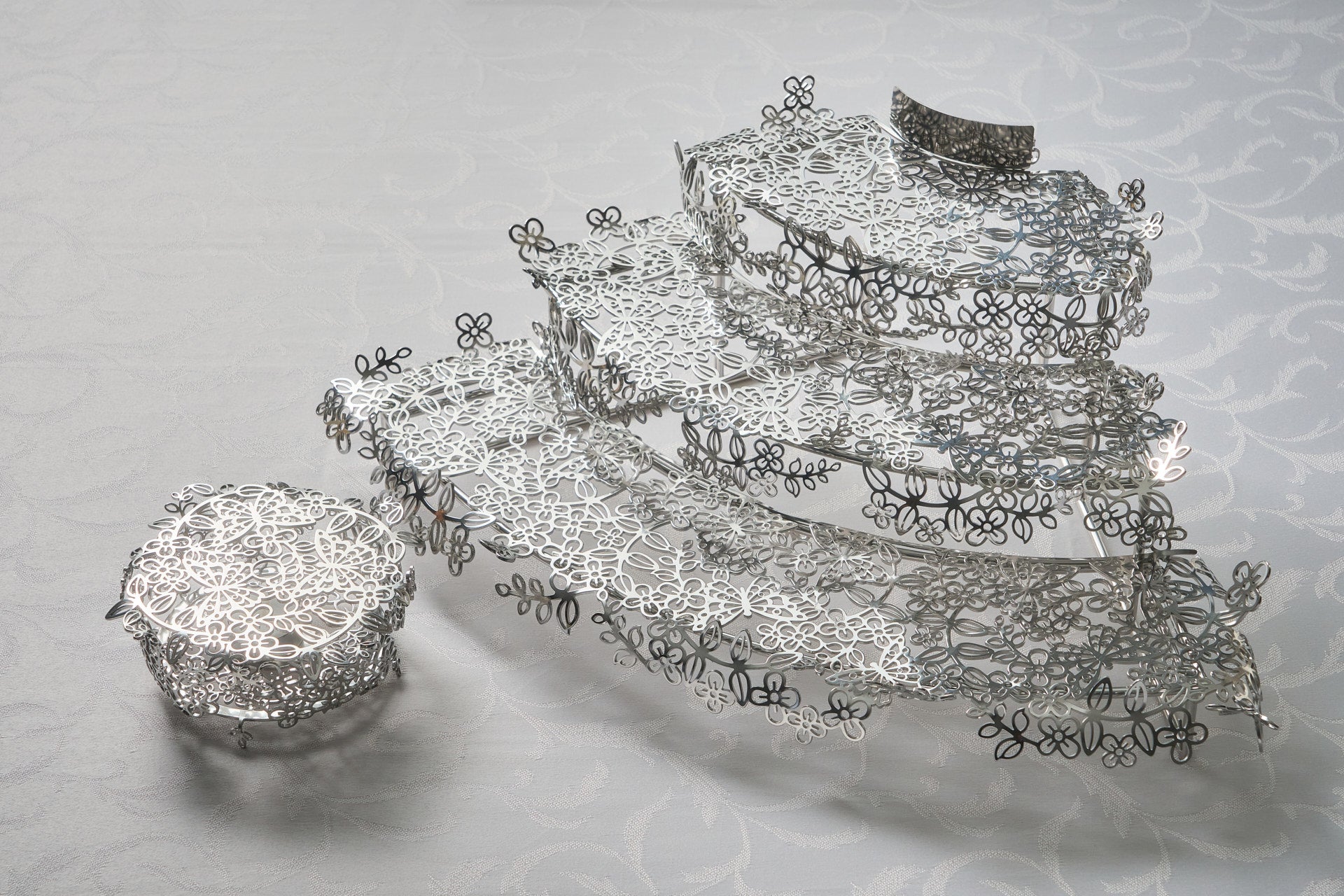 ブランドディレクターの徳永 彌生氏が、水門・防水扉の製造工程で生じるステンレスの端材に着目し、独自に開発した特殊な研磨技術により、光り輝くテーブルウェアへと生まれ変わらせました。特長的なフォルムはヒルトン東京お台場の外観をモチーフとしており、どの角度からもスイーツやセイボリーが美しく見えるように設計されています。
