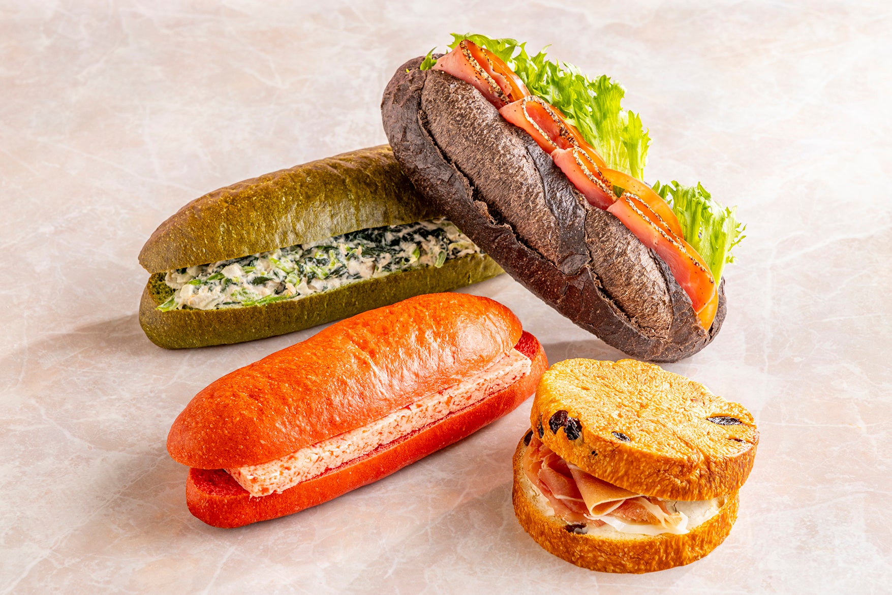 また、バリエーション豊かな4種のサンドイッチもご用意。ココアバゲットにターキーパストラミやフレッシュな野菜を挟んだ食べ応えのある一品や、フランボワーズのパンに甘酸っぱいいちごバターを合わせた春らしいデザートサンドなど、お好きなだけお楽しみください。