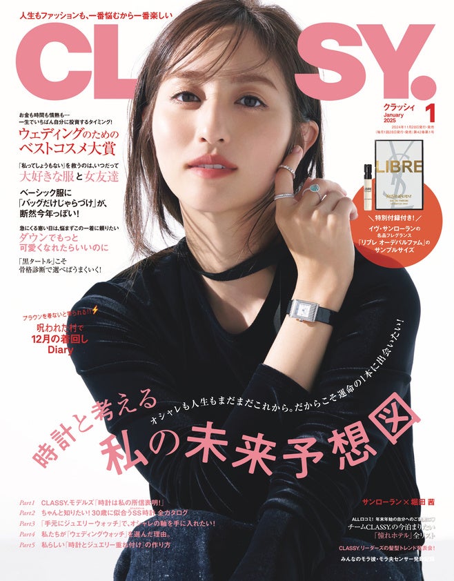 『CLASSY.』1月号発売!/YSLの名品フレグランスが特別付録に/俳優・塩野瑛久さんインタビュー/ブラウンを着ないと祟られる⁉ 因習村で着回しDiary/大特集は「時計と考える私の未来予想図」