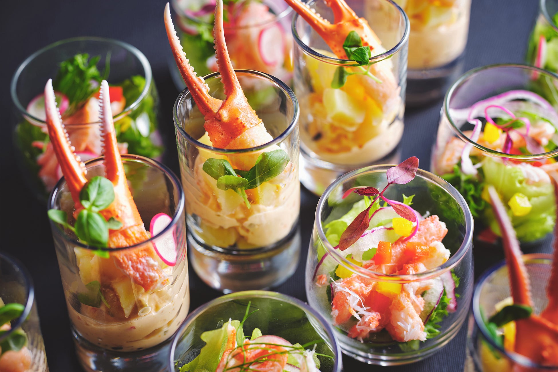 海鮮丼(ディナータイム限定)/ カニと海老のちらし寿司 / カニサラダ / カニ爪と有頭海老 ガーリックオイルソース など