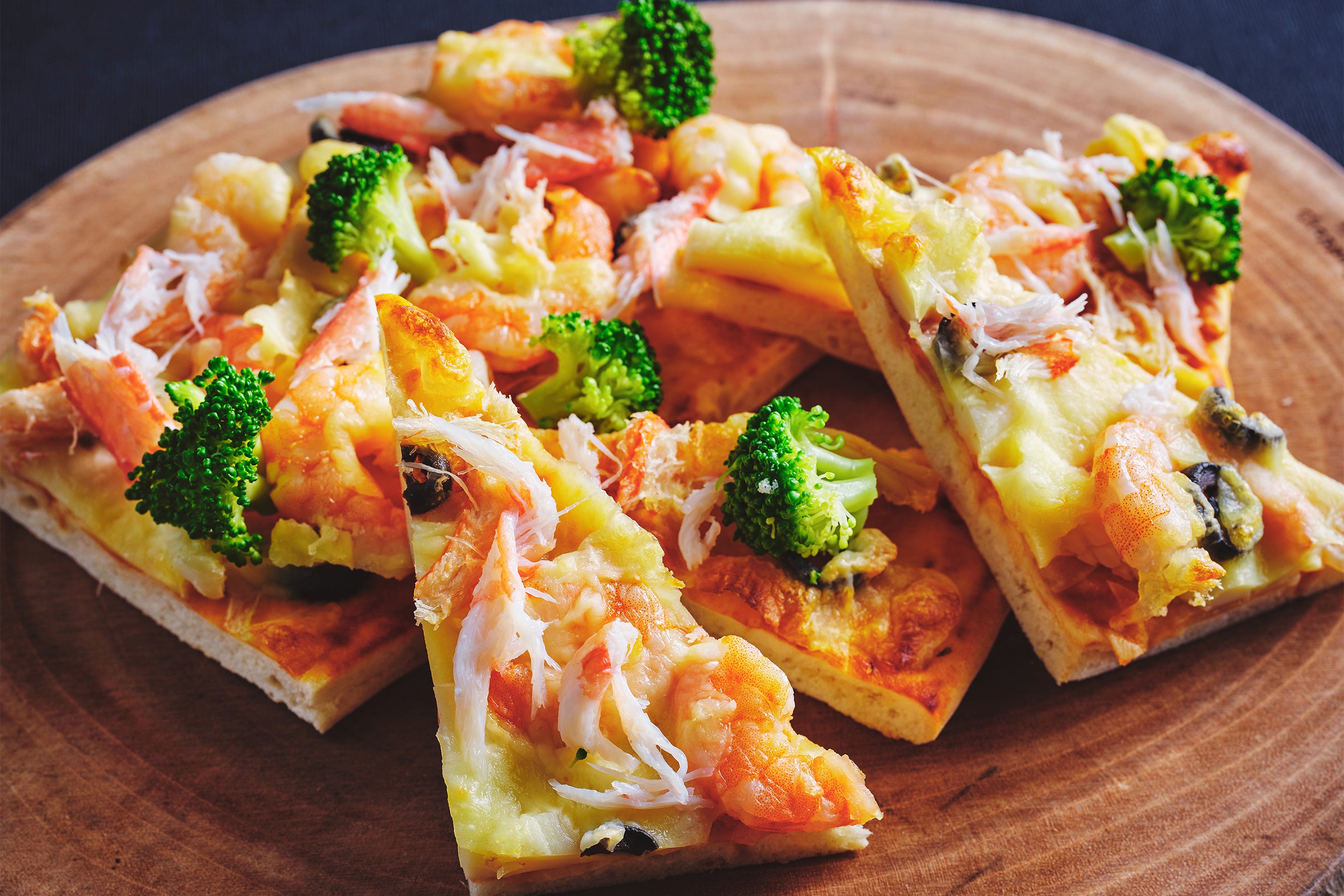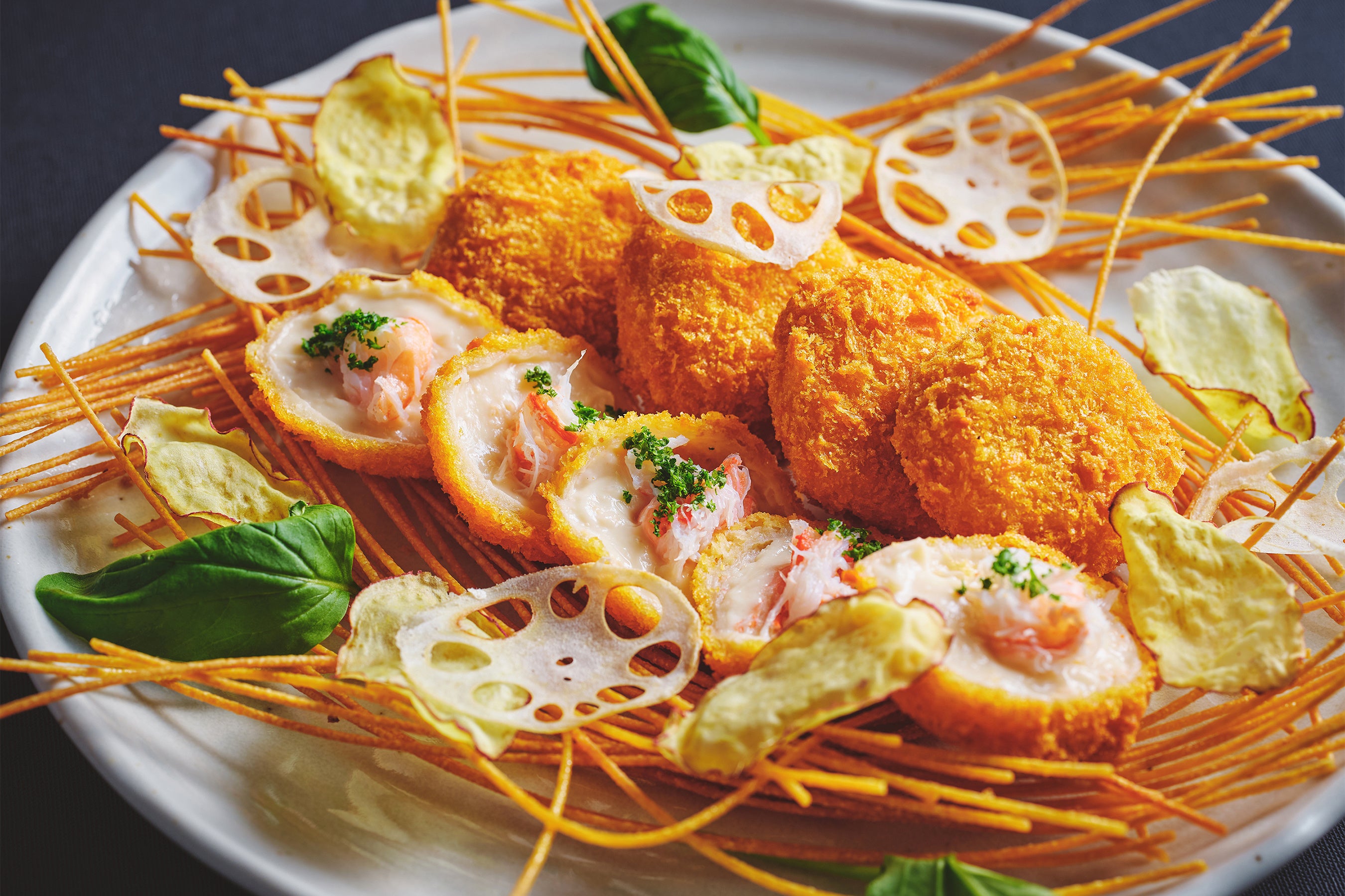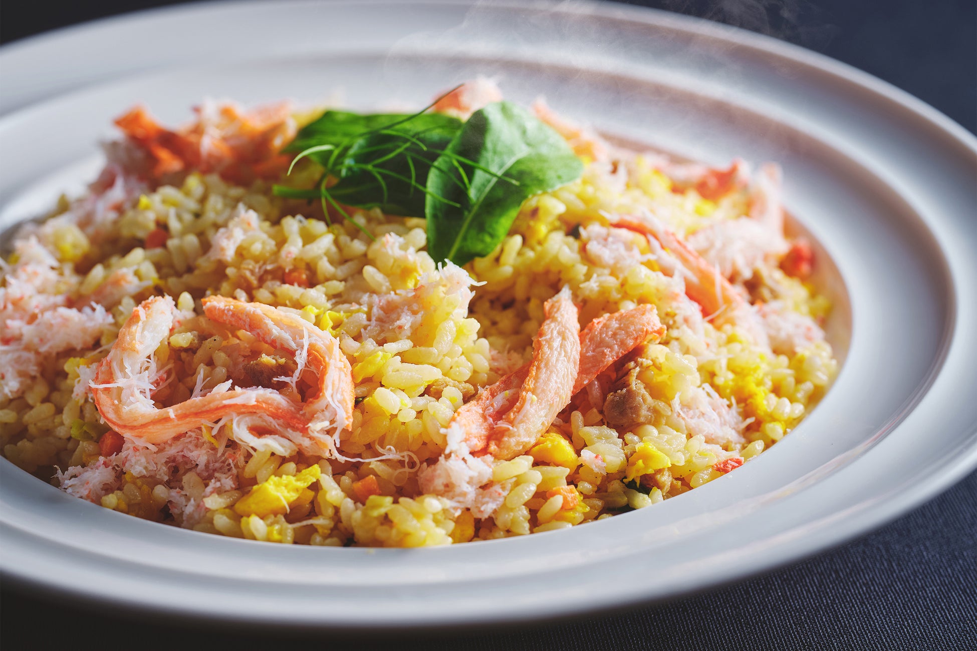 カニ甲羅グラタン(ディナータイム限定)/ カニとスケソウダラの朴葉蒸し ⻄京味噌ソース(ディナータイム限定) / カニと卵のピラフ(ランチタイム限定)/ カニとシーフードのピザ / カニコロッケ / カニ焼売 など