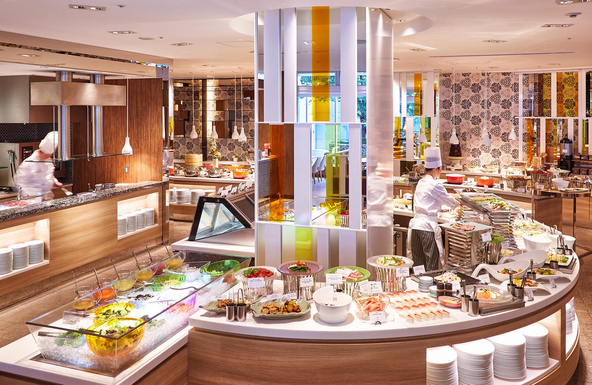 明るく開放感あふれる大きな窓からは、さわやかな中庭をのぞめ、ファミリーやグループでゆったりお食事をお楽しみいただけます。バラエティ豊かな料理の数々に加え、各種フリードリンクプランもご用意しておりますので、お集まりにもぴったり。何度でもお越しいただき、ご満足いただくために、スタッフ一同おもてなしの心でお越しをお待ちしております。