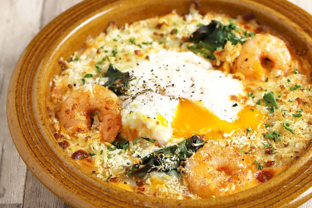 ・淡路島の北坂卵と海老とほうれん草のトマトクリームパスタ グラタン仕立て(3630円)