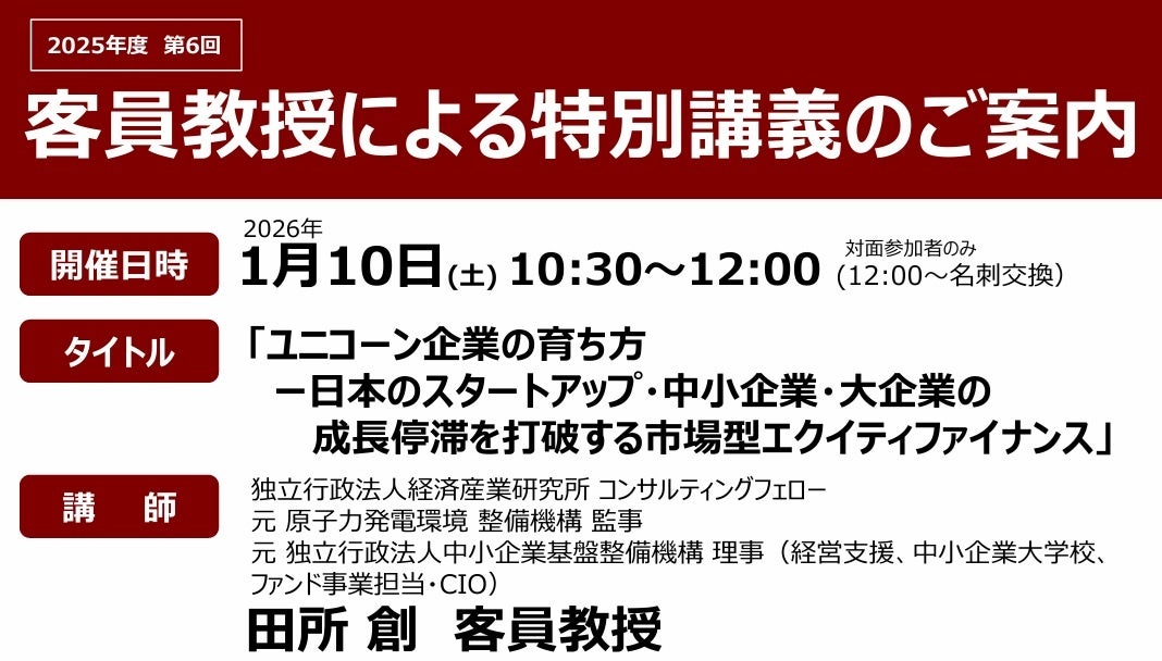 NSGグループ 事業創造大学院大学(以下「本学」、新潟県新潟市中央区米山3-1-46)では、一般の方も無料で参加できる特別講義を開講いたします。今回の講師は、田所創客員教授(独立行政法人経済産業研究所 コンサルティングフェロー、元 原子力発電環境 整備機構 監事、元 独立行政法人中小企業基盤整備機構 理事 [経営支援、中小企業大学校、ファンド事業担当・CIO] )です。