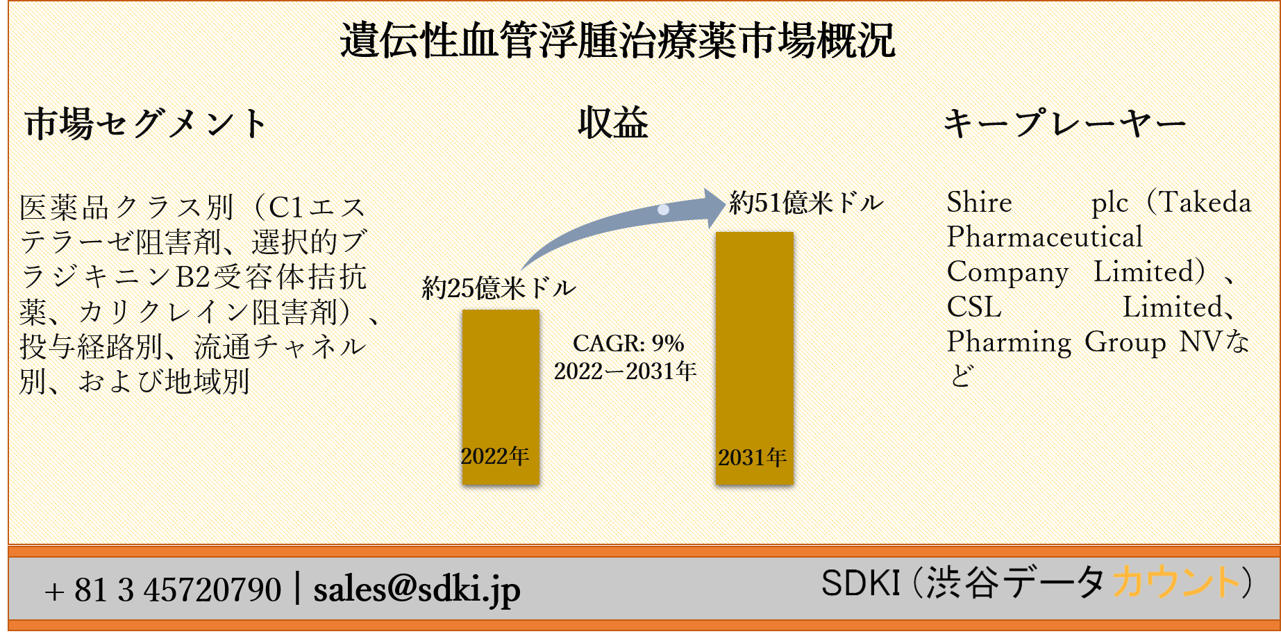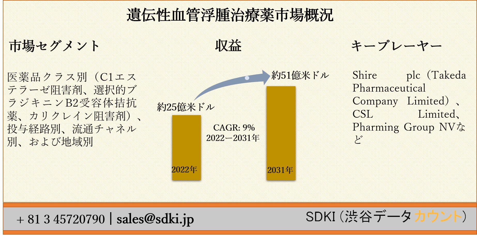 SDKI Inc.が「遺伝性血管浮腫治療薬市場ー世界予測2022ー2031年」の新調査レポートを2022年02月14日に発刊しました。レポートは、業界の新ビジネスチャンスとともに、市場とその成長見通しの完全な評価を提供します。さらに、2022ー2031年の予測期間中の市場規模と年間成長率が含まれています。