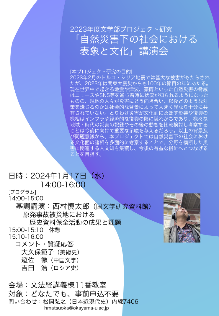 【岡山大学】2023年度文学部プロジェクト研究 講演会「自然災害下の社会における表象と文化」〔1/17,水 岡山大学津島キャンパス〕
