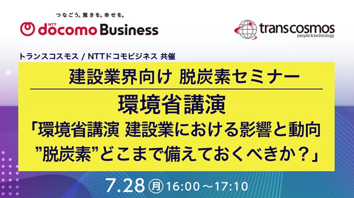 トランスコスモスは、オンラインセミナー<トランスコスモス/NTTドコモビジネス 共催>【建設業界向け 脱炭素セミナー】「環境省講演 建設業における影響と動向“脱炭素”どこまで備えておくべきか?」を7月28日(月)に開催します。