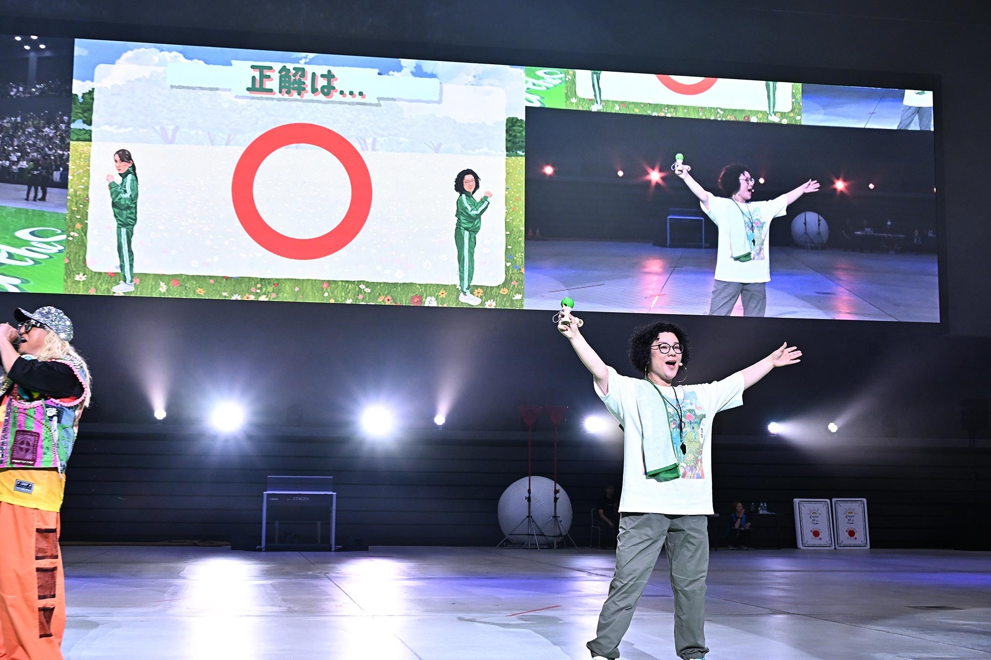 「2択クイズ大会」では、スー美香が二重跳びや流鏑馬(やぶさめ)など番組の過去エピソードにまつわる問題に挑戦しました。スーのけん玉チャレンジでは、ハーフタイムショーを盛り上げたDJ KOOさんが「けん玉のスペシャリスト」として再登場。的確なアドバイスが功を奏し、見事けん玉の技「大皿」を成功させ、会場を大いに沸かせました。