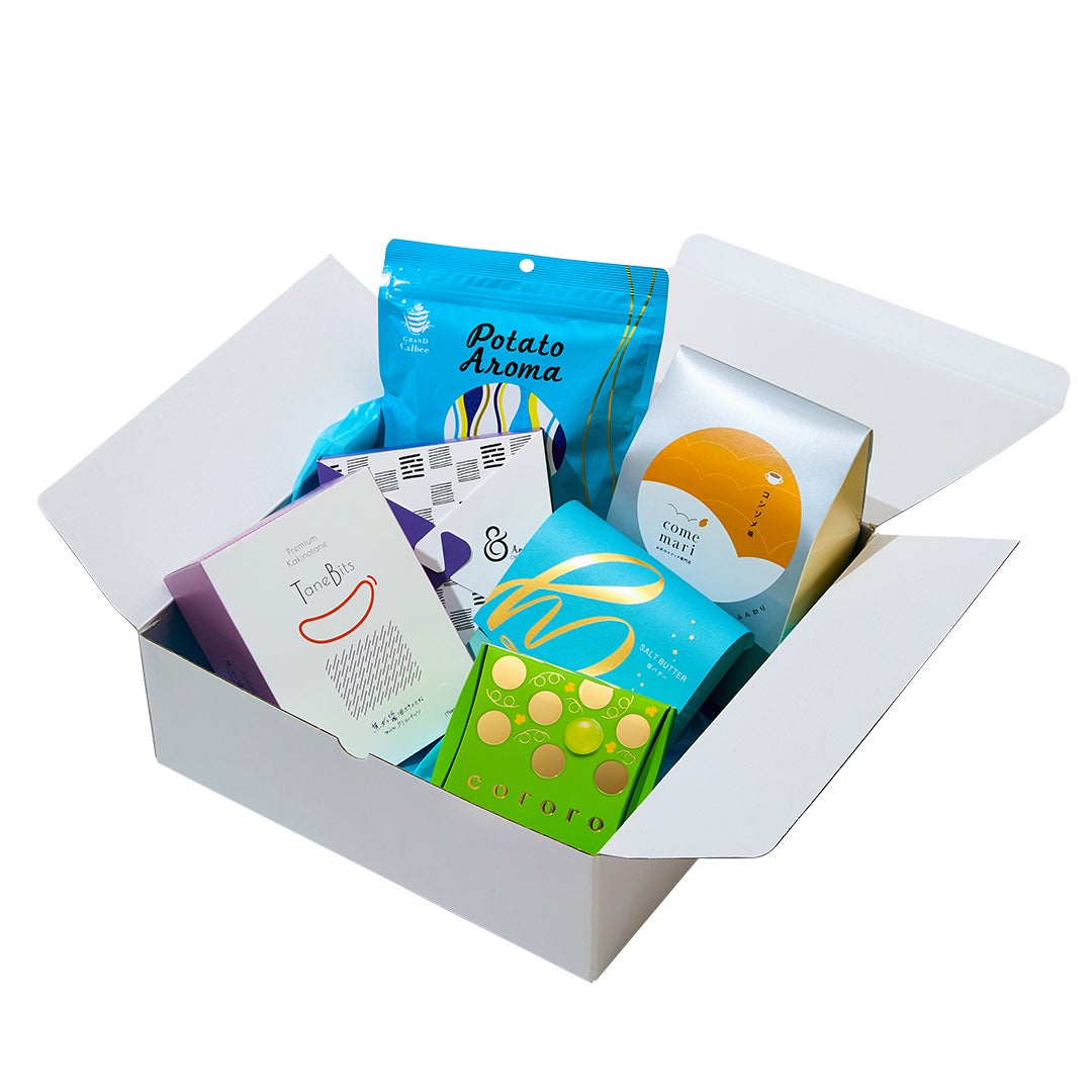 「グランカルビー」「コロロ」「タネビッツ」「ハッピーターンズ」「&OKOSHI(アンドオコシ」「コメマリ」の人気商品を詰め合わせたオリジナルギフトボックスが登場します。