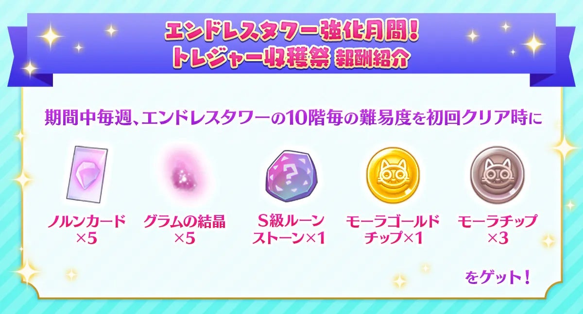 期間中は毎日、Base経験値やJob経験値をたっぷり獲得できる各種経験値ポーションや、プレイ時間を増やすことができる「時空冒険ポーション」をゲーム内メールから獲得できます。さらに、「エンドレスタワー強化月間!トレジャー収穫祭」を開催。ダンジョン「エンドレスタワー」の10階層をクリアするごとに、「ノルンカード」や「S級ルーンストーン」などの豪華報酬を獲得できます。