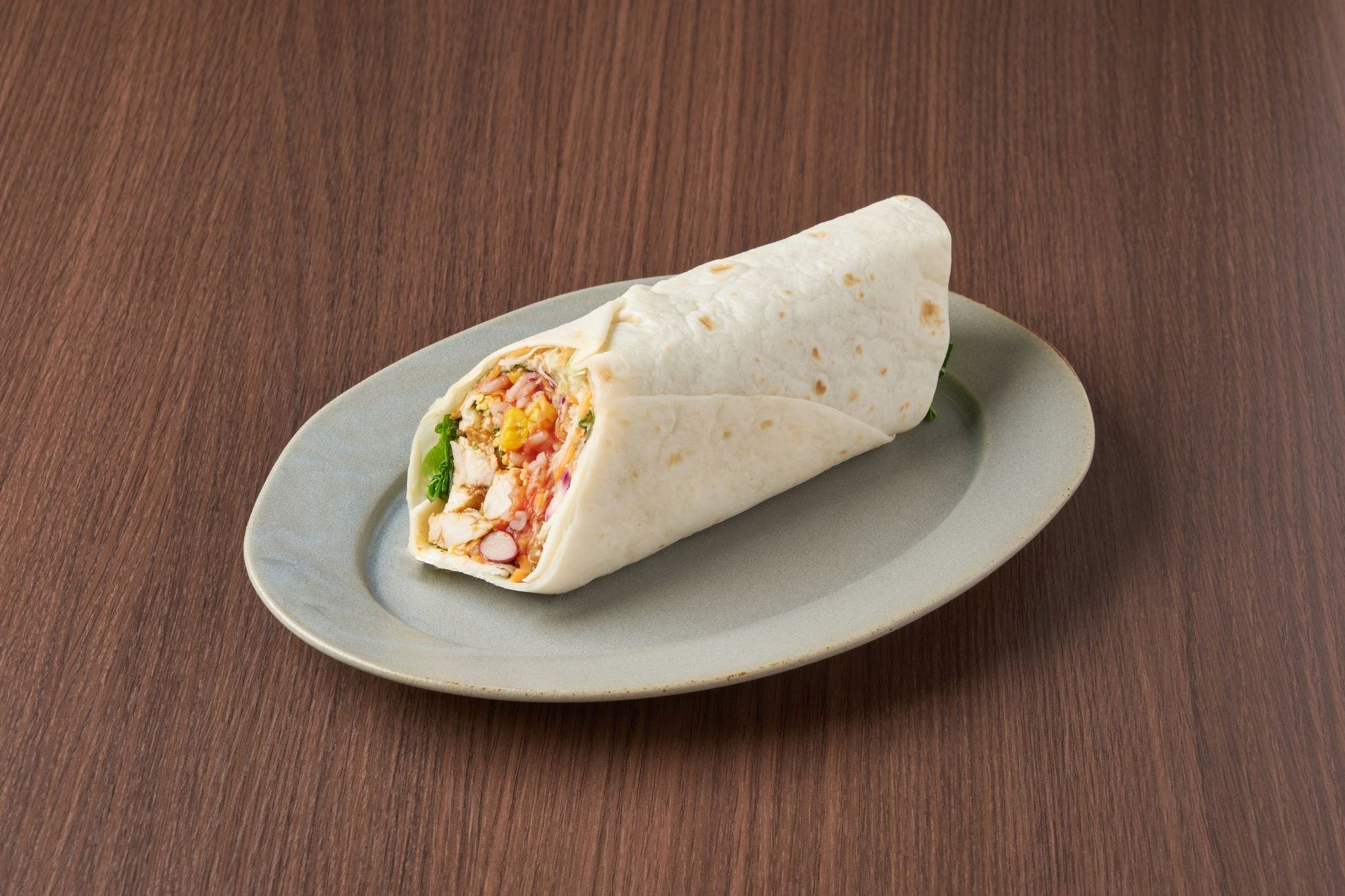 【内容】キャベツ、人参、リーフなどの彩り豊かな野菜と雑穀の上に、低温調理で柔らかく仕上げたメキシカンチキンと、原木スライスならではの風味豊かなチェダーチーズを乗せ、トルティーヤで巻き上げました。たんぱく質が15.6g摂れるサラダラップです。