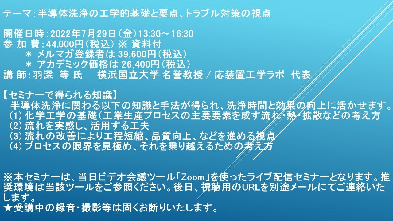 先端技術情報や市場情報を提供している(株)シーエムシー・リサーチ(千代田区神田錦町: https://cmcre.com/ )では、 各種材料・化学品などの市場動向・技術動向のセミナーや書籍発行を行っておりますが、 このたび「半導体洗浄の工学的基礎と要点、トラブル対策の視点」と題するセミナーを、 講師に羽深 等 氏 横浜国立大学 名誉教授 / 応装置工学ラボ 代表)をお迎えし、2022年7月29日(金)13:30より、 ZOOMを利用したライブ配信で開催いたします。 受講料は、 一般:44,000円(税込)、 弊社メルマガ会員:39,600円(税込)、 アカデミック価格は26,400円(税込)となっております(資料付)。